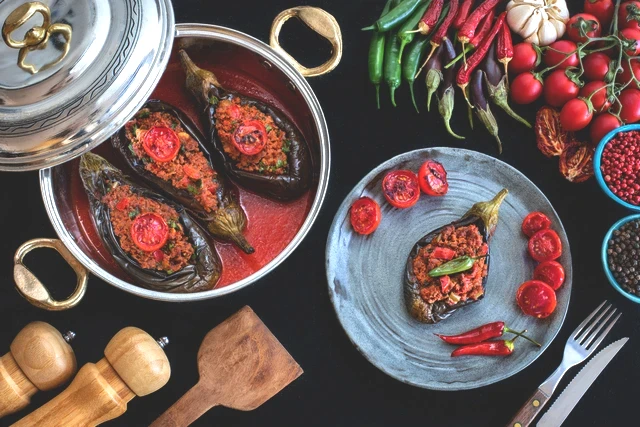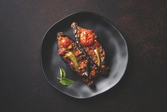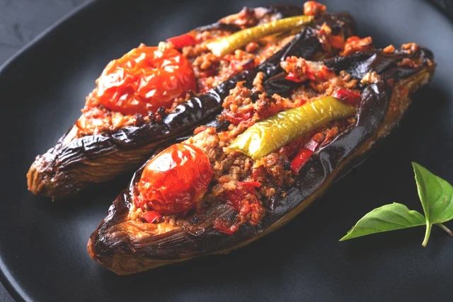 Kızaran patlıcanları fırın tepsisine dizin. Kesik yerlerini kaşıkla açarak hazırladığınız kıymalı harcı içine doldurun. Üzerini ise kalan domates ve biber dilimleriyle süsleyin. Sosu hazırlayıp tepsinin tabanına dökün. Önceden ısıtılmış 200 derece fırında yaklaşık 25-30 dakika pişirin.