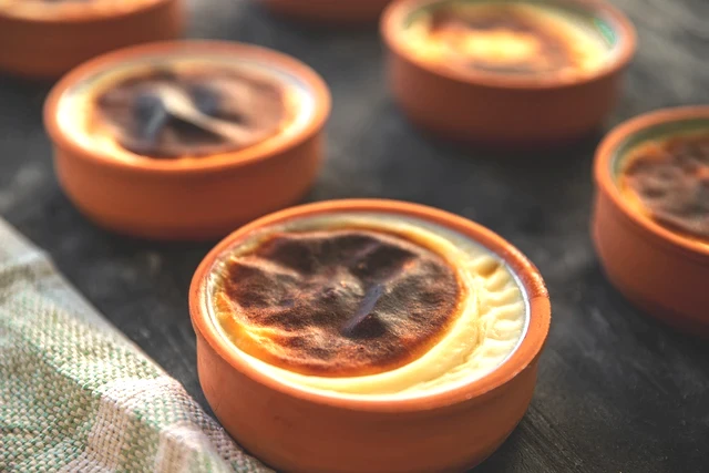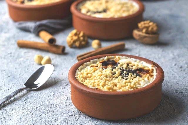 Sıcak sütlacı fırın kaselerine (güveç kaplarına) paylaştırın, üzerlerinde bir parmak boşluk kalacak şekilde yerleştirin. Kaseleri büyük bir fırın tepsisine dizin.